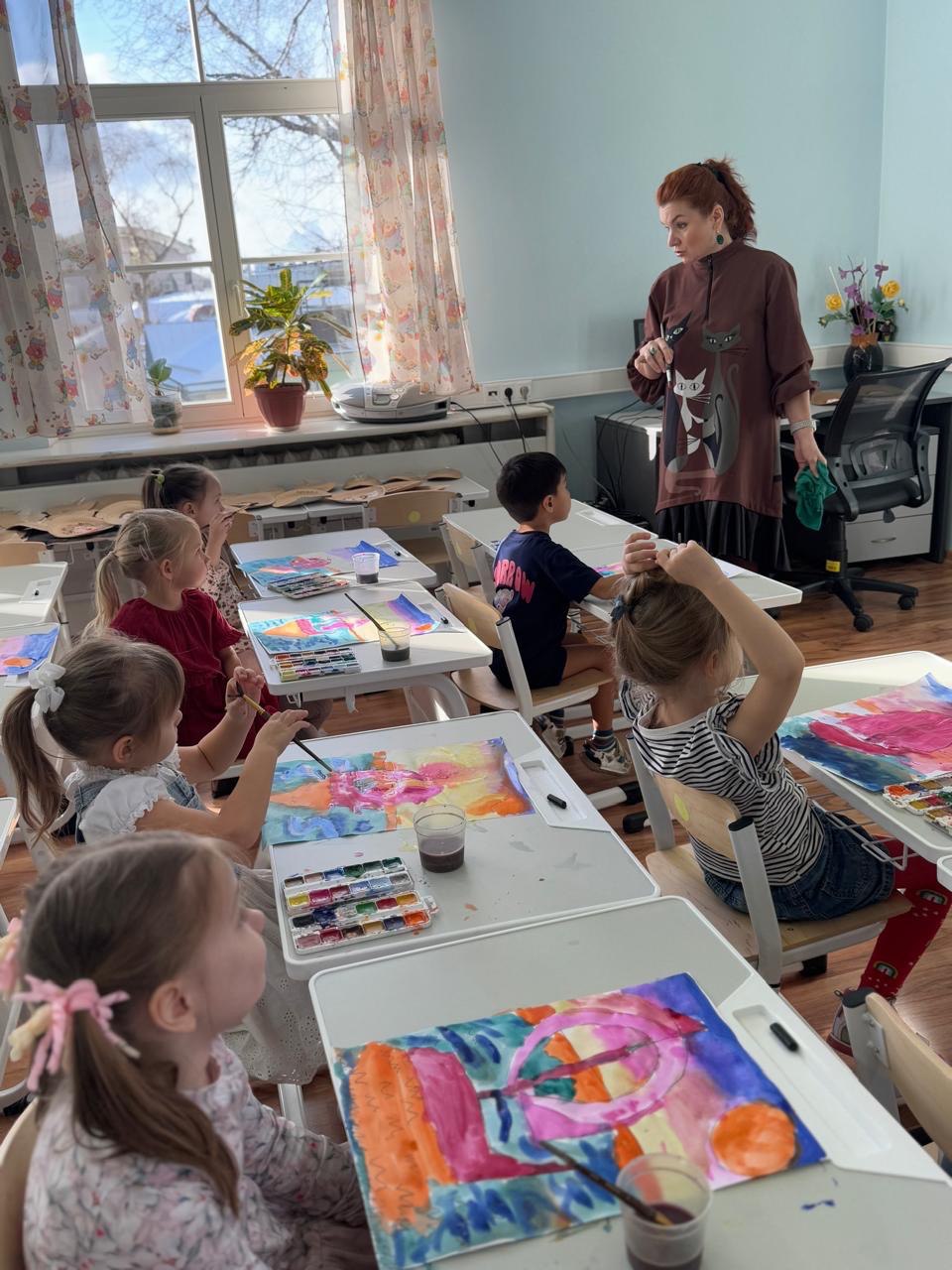 В изостудии «Волшебная кисточка» дети совместно со своим педагогом Плотниковой Г.В. отметили день акварели. Сегодня на занятии дети использовали акварельные краски, разводимые водой, для создания плавного перехода от одного оттенка к другому. Работали по мокрому – краску наносили на предварительно смоченный водой лист. Сегодняшние работы отличались прозрачностью, плавностью цветовых и тональных переходов.