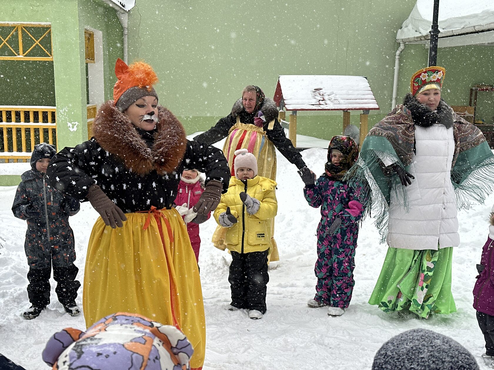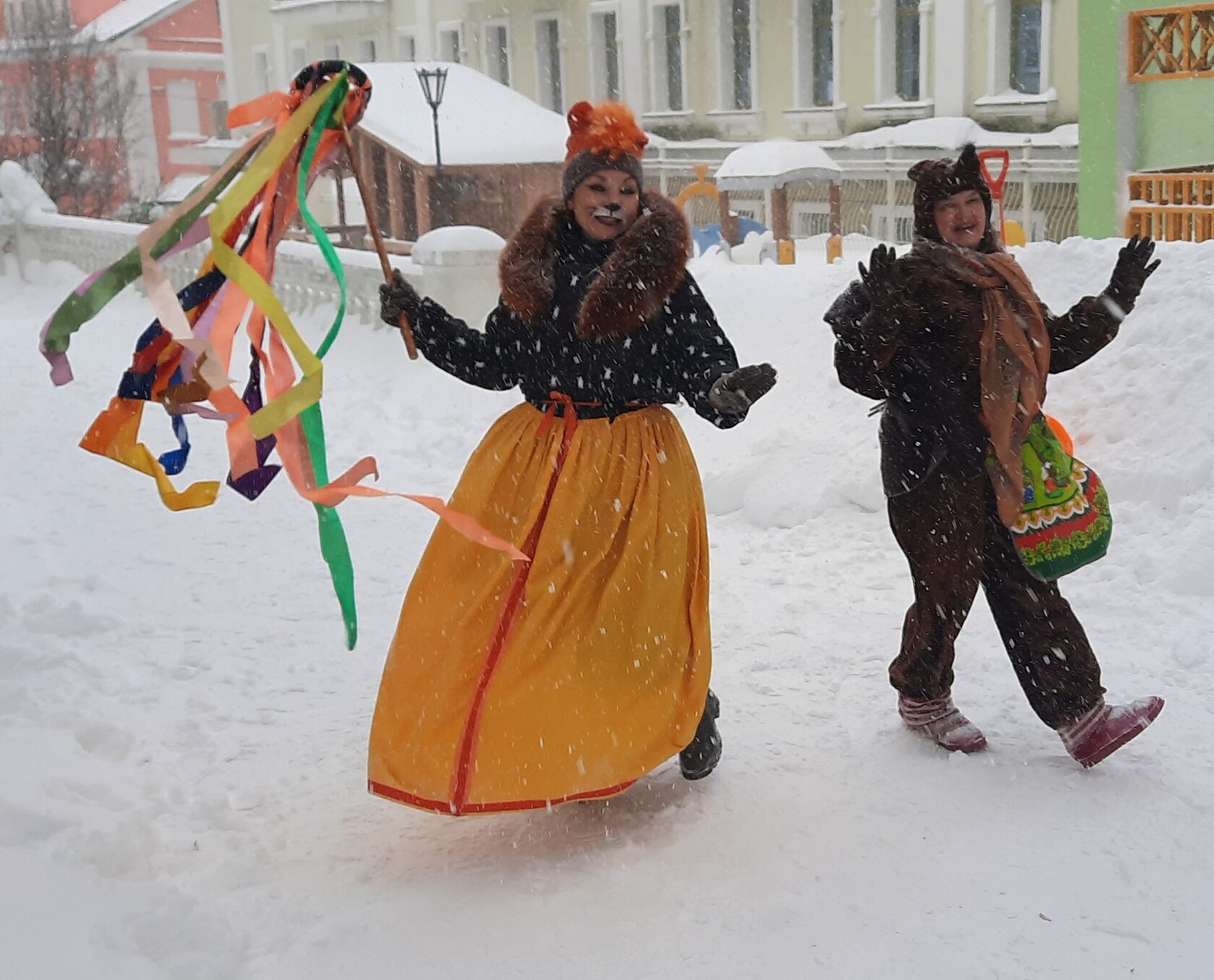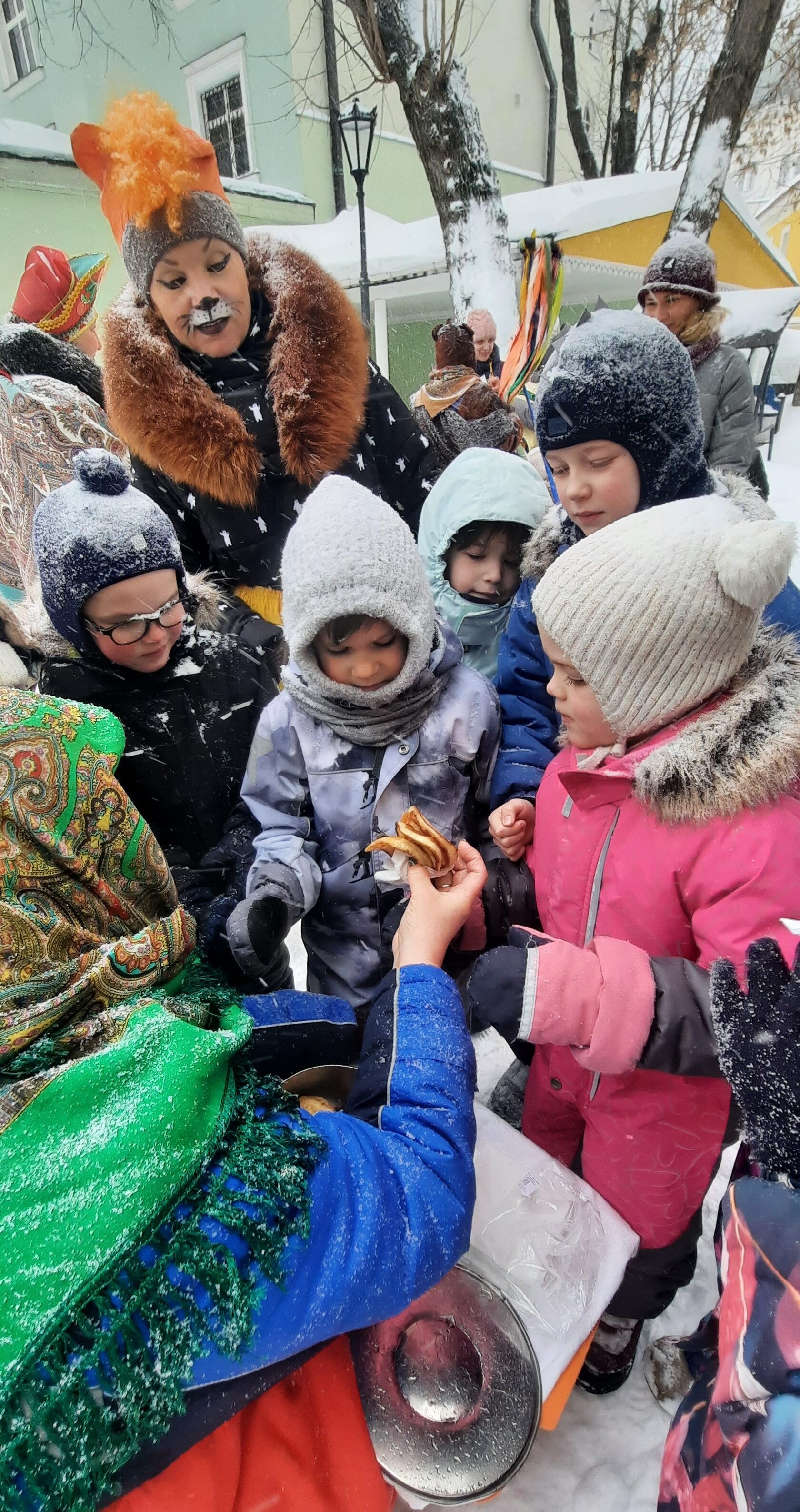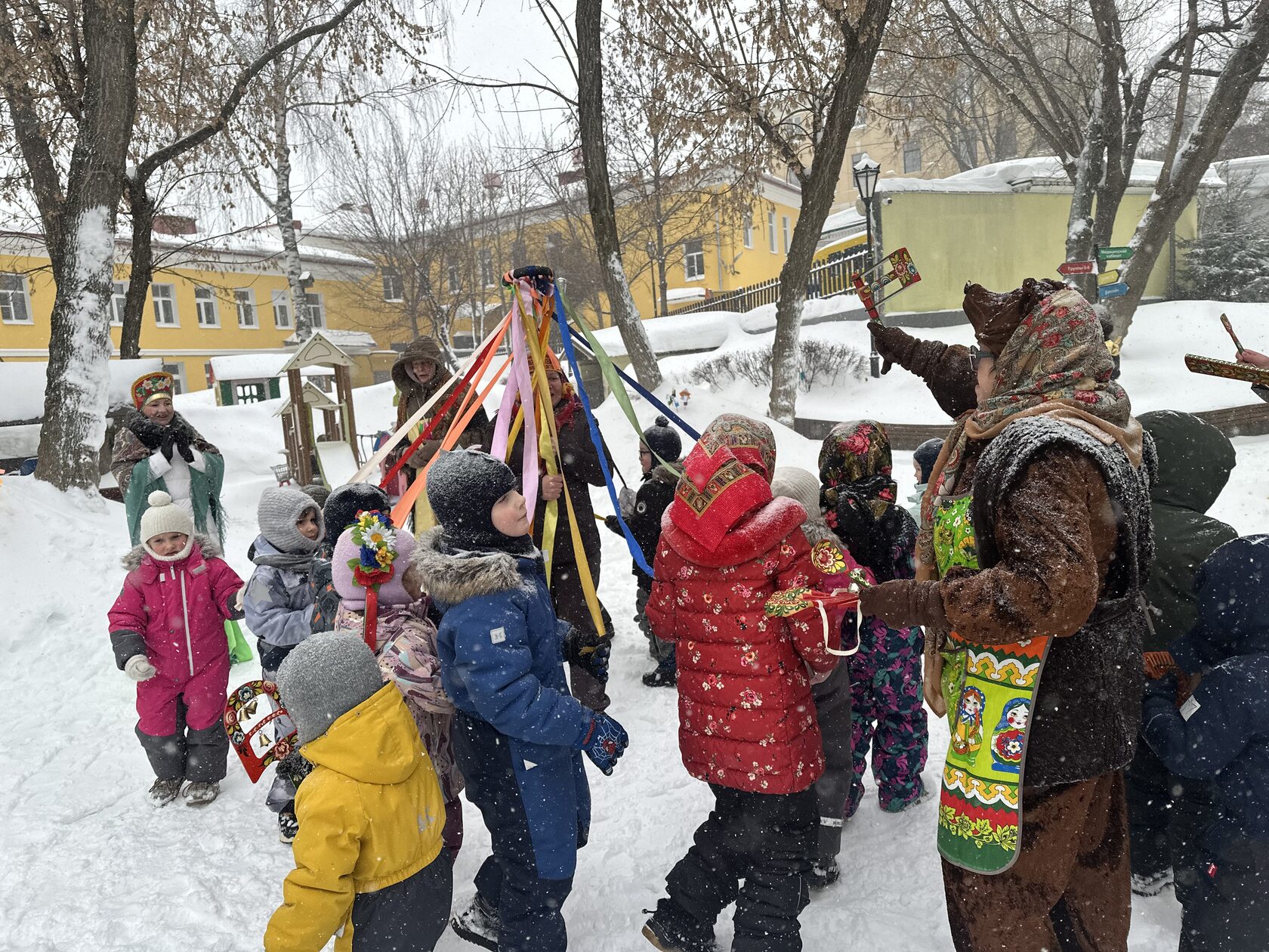 а затем празднование переместилось на улицу, где ребята играли в русские народные игры, водили хороводы, позабавились со свежевыпавшим снегом и приняли участие в мастер-классе игры на народных инструментах.